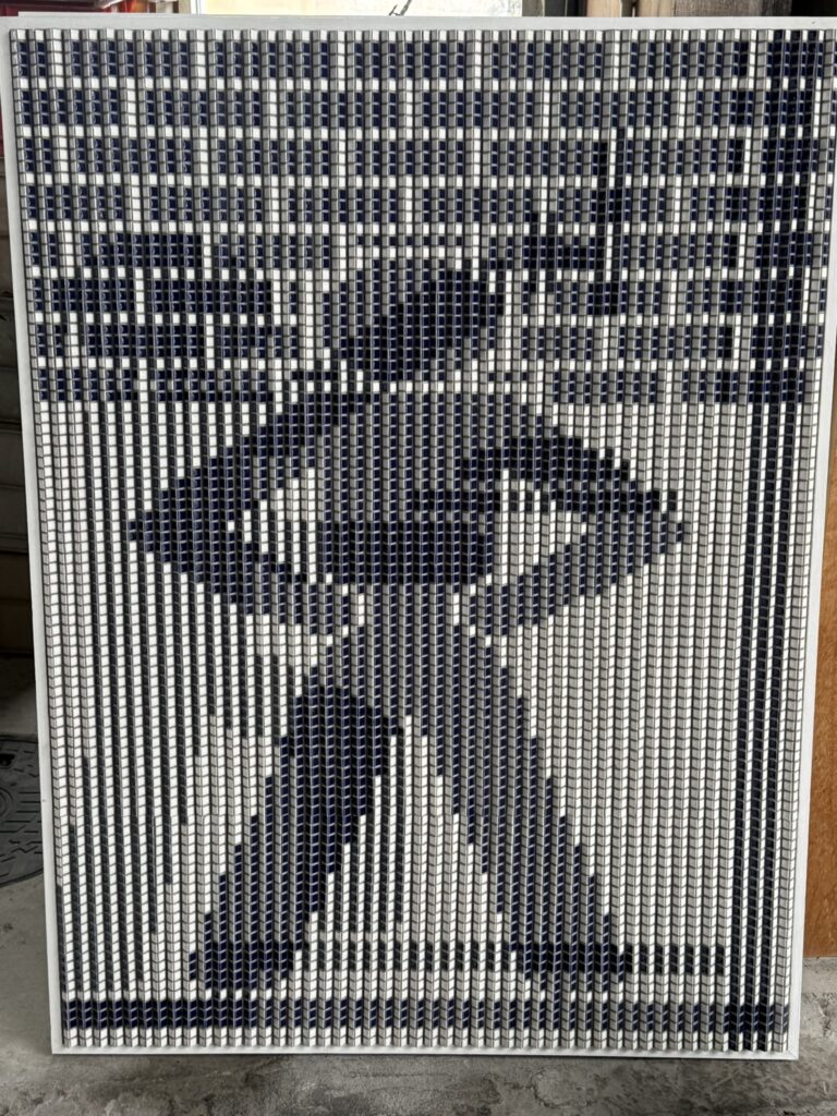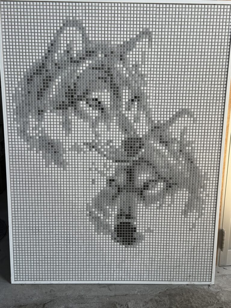 続いては、白黒のモノトーンで描かれた犬のアートです。 白、グレー、黒といった同系色のタイルの濃淡だけで、ワンちゃんのフワッとした毛並みや、こちらを見つめる愛らしい表情を浮かび上がらせています。ドット絵の究極系とも言える、モザイクタイルならではの表現方法です。