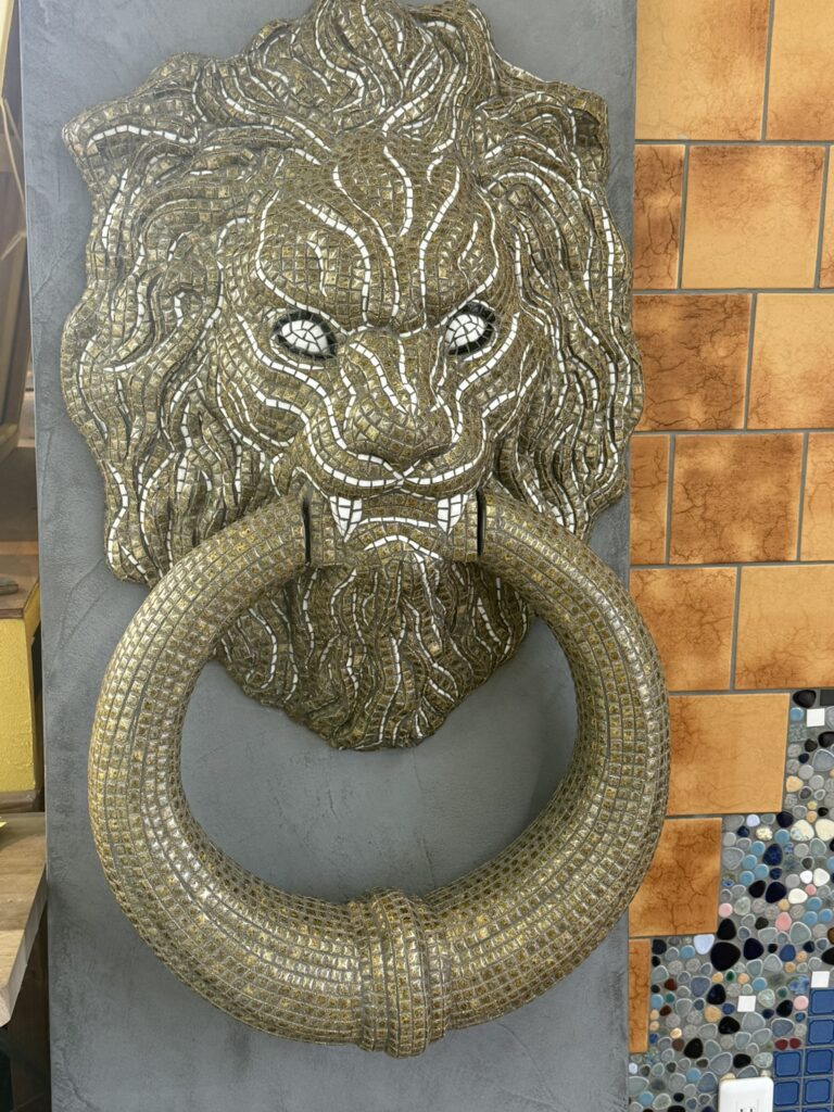 こちらは打って変わって、ものすごい迫力のライオンのタイルアートです。 全体をゴールドやブラウン系のタイルでまとめ、威厳ある表情を作り出しています。注目していただきたいのは、顔周りの細かい白い筋の部分です。 これは四角いタイルをそのまま貼るのではなく、タイル用ニッパーで細かくカットしたものを一つ一つ埋め込んで、毛並みや筋肉の隆起を表現しています。まさにプロの凄みを感じる作品です。