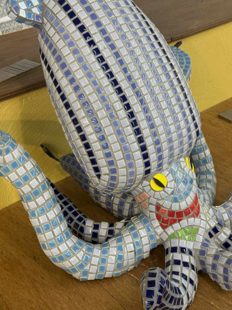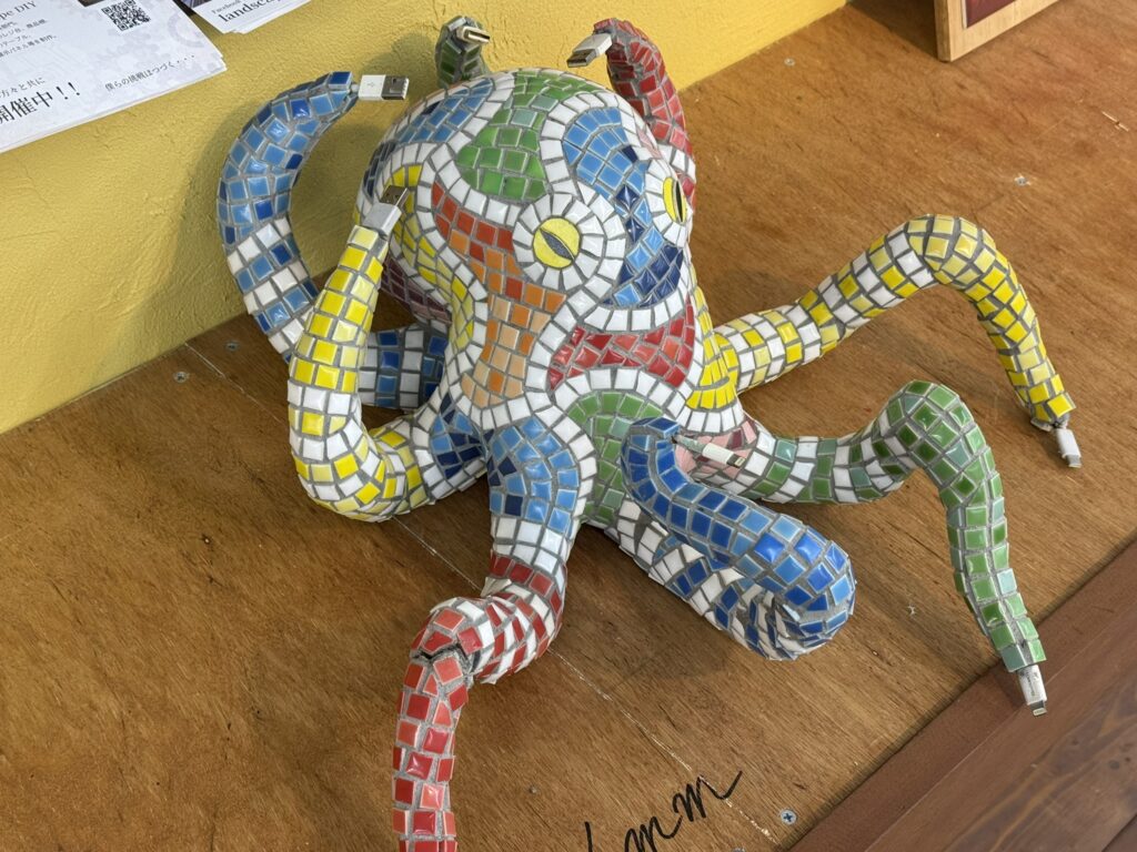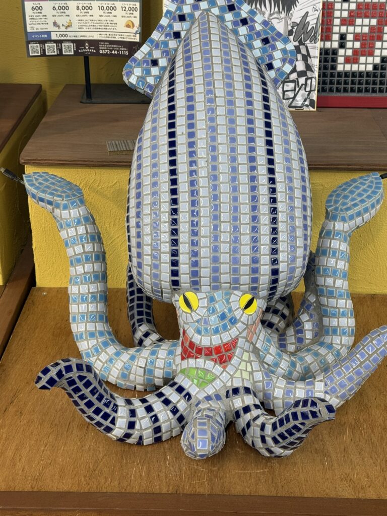 次は、見ていて思わず笑顔になってしまう海の生き物シリーズです。 めちゃくちゃイカっているような、今にも動き出しそうな荒ぶるポーズのイカのオブジェ。青系のタイルを巧みに使い分け、足の吸盤の裏側まで細かく作り込まれています。 そして、その隣には同じくイカっているタコのアートも。カラフルな配色と、うねるような足の表現が素晴らしいですね。店舗の看板娘(?)として置いたら絶対に目を引くデザインです。