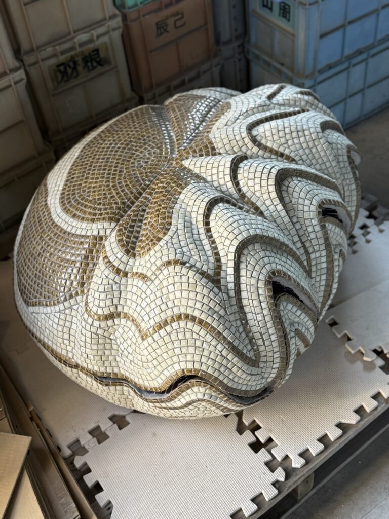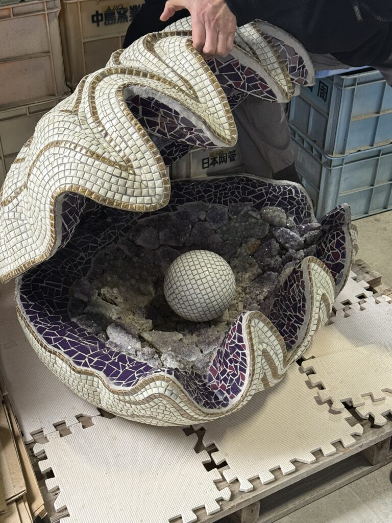 続いては、巨大なアコヤ貝のタイルアートです。 外側のリアルな貝殻の模様も10角タイルの色分けで見事に表現されていますが、なんとこのオブジェ、パカッと開けることができるのです。 中には大きな真珠を模したボールが入っており、内部の身の部分には紫色のクラッシュタイルが敷き詰められています。質感の違いをタイルの種類で表現する、見事なアイデアですね。