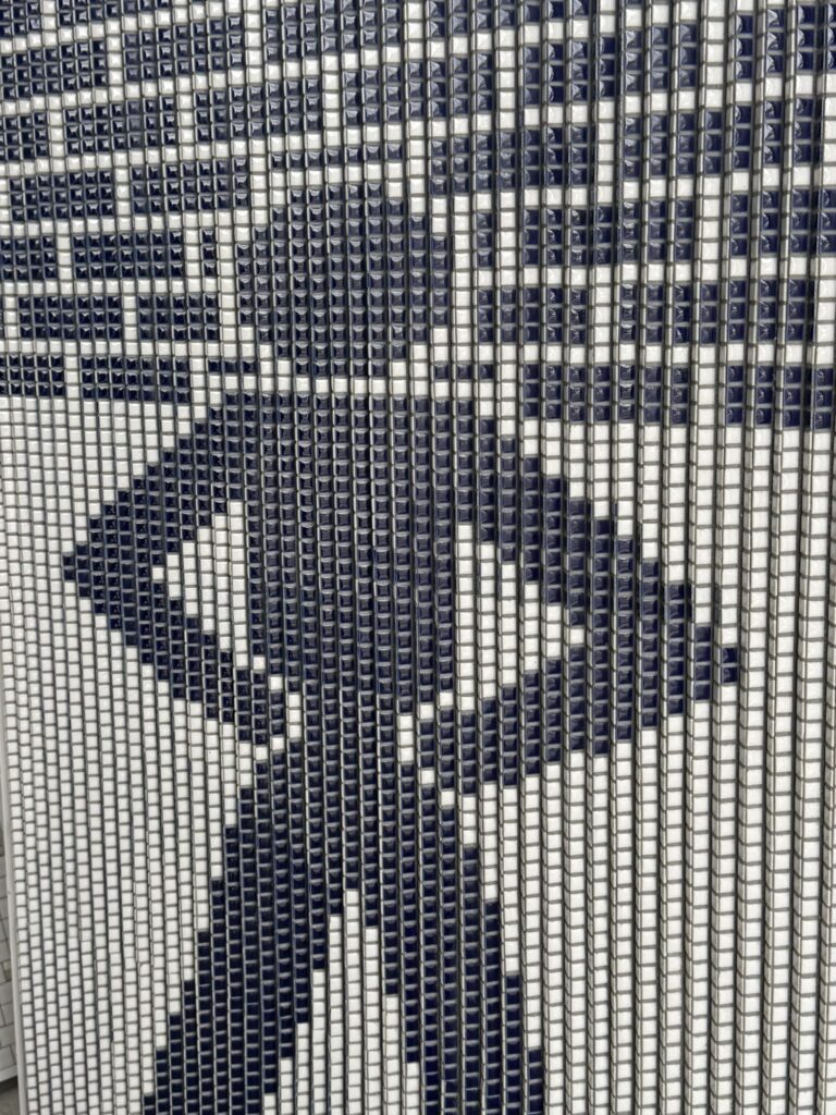 まずは、こちらのピクトグラムのアートです。 一見すると普通のタイルの壁画に見えますが、近づいてみると下地が山型(▲)に凹凸のある形になっています。 この▲の斜面部分に白と青のタイルを計算して貼り分けているため、歩きながら見る角度が変わっても、絵柄がはっきりと浮かび上がって見えるという目の錯覚を利用したアートです。 プロの目から見ても、はっきり言ってこれは並べる手間がすさまじいです。作った職人さんの根気に頭が下がります。
