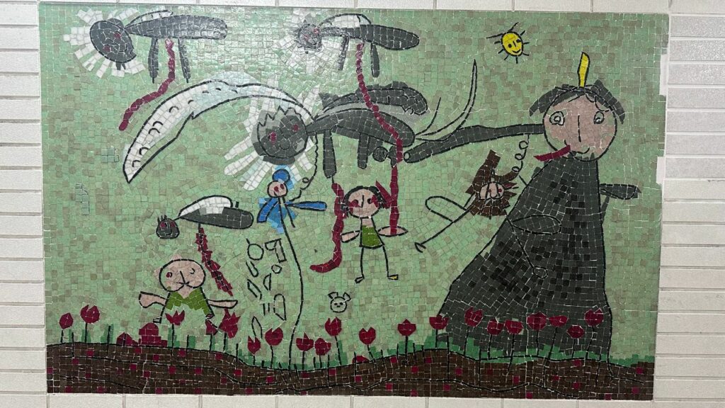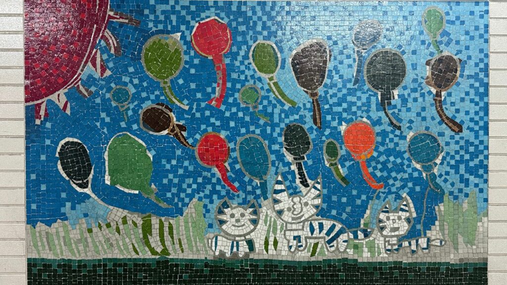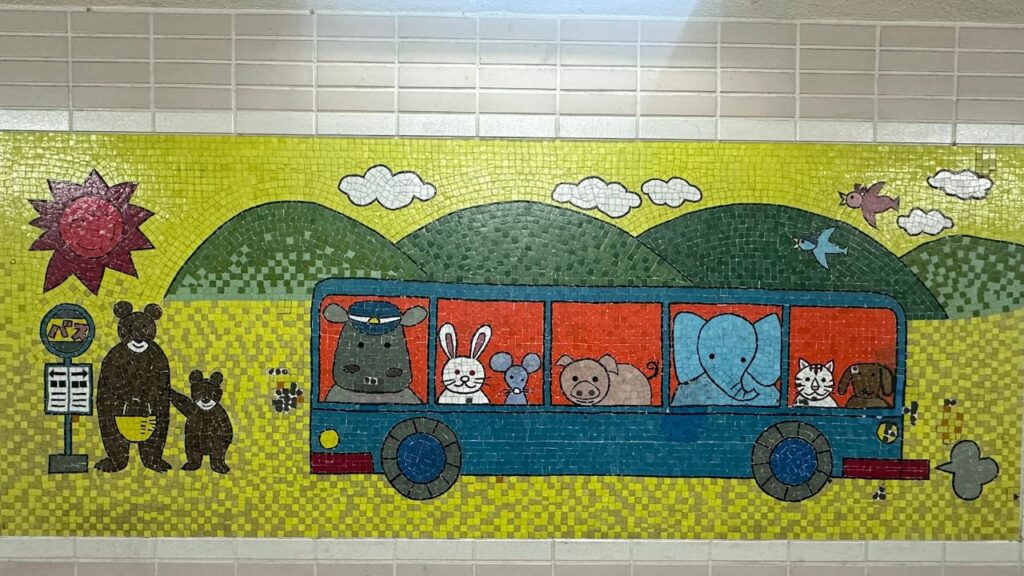 これらは、地元の小学生などが描いた原画を元にしているのかもしれません。 子供の自由な線のゆらぎを、四角いタイルで一生懸命表現しているところに職人の愛を感じます。