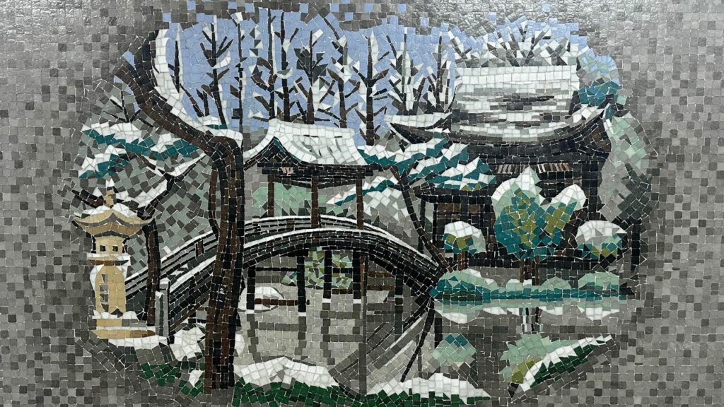 ▼雪景色と橋 白とグレー、そして黒のタイルだけで表現された雪景色。 水墨画のような静けささえ感じます。
