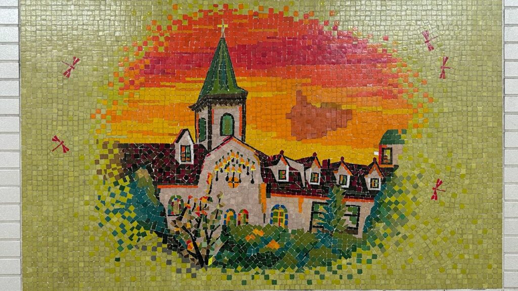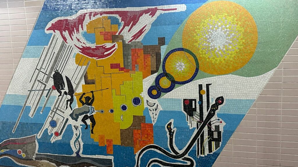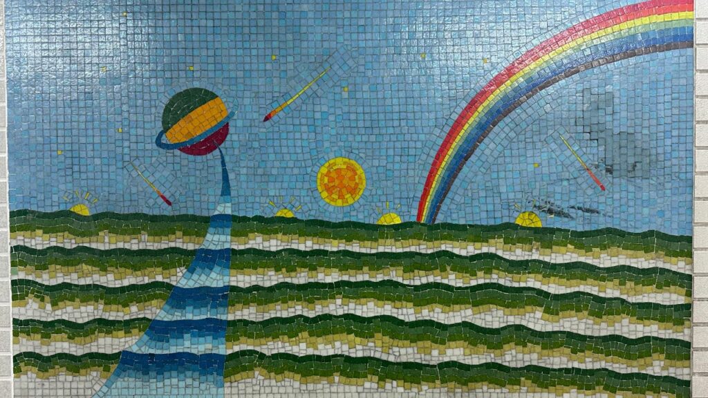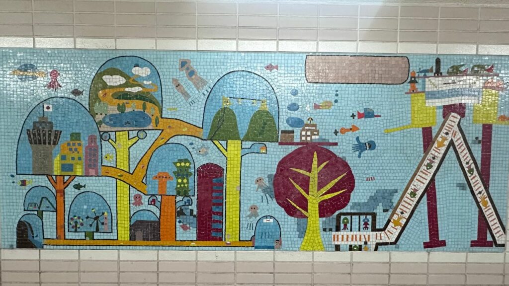一見ただの通路ですが、壁面を見てください。 そこには、多治見のタイル文化を象徴するような、巨大なモザイクタイルアートが広がっているのです。