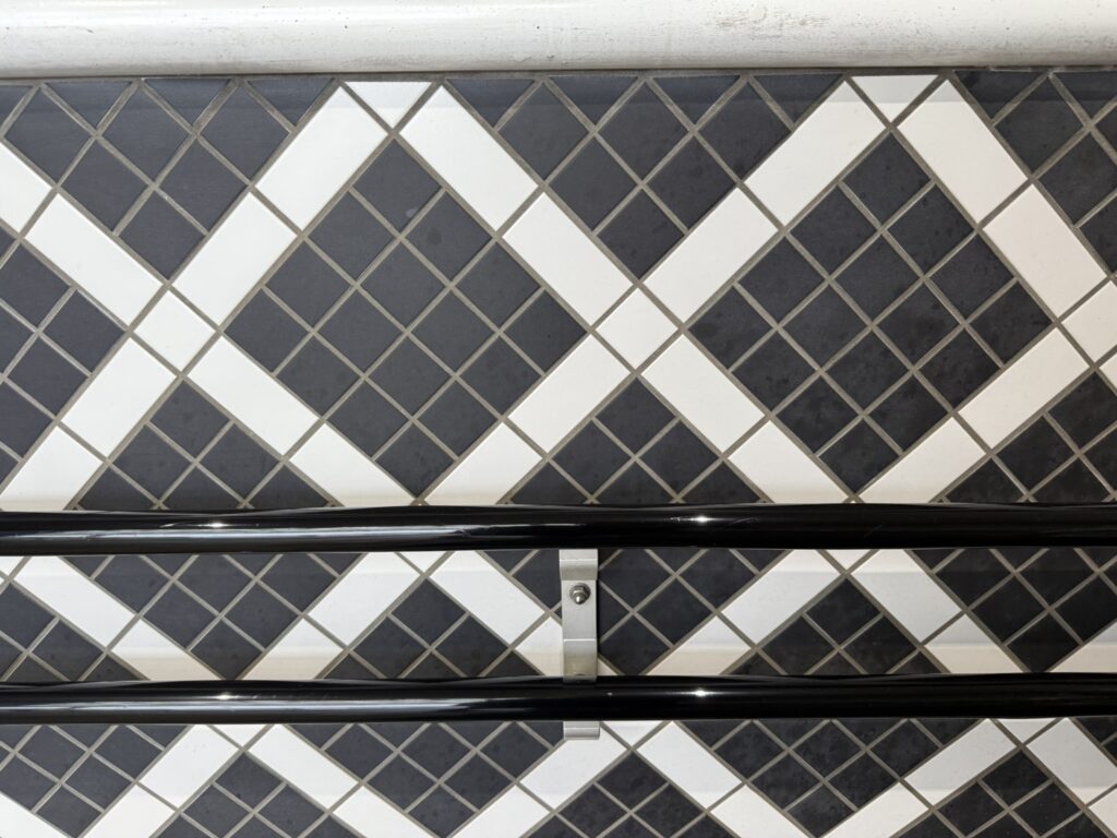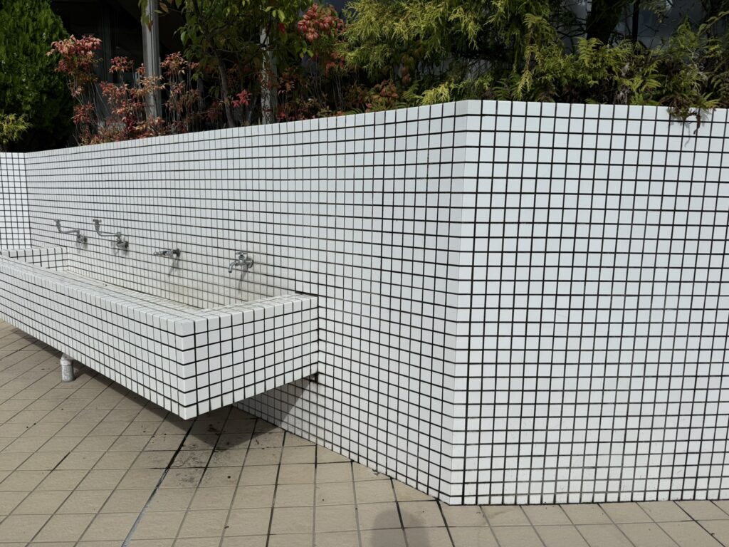 白45角でまとめた手洗い場は、どこか懐かしいノスタルジックなムード。清潔感・明度・反射のバランスが良く、照明映えもしやすい。商業施設はもちろん、自宅洗面のリフレッシュにも“ちょいクラシック”が効きます。