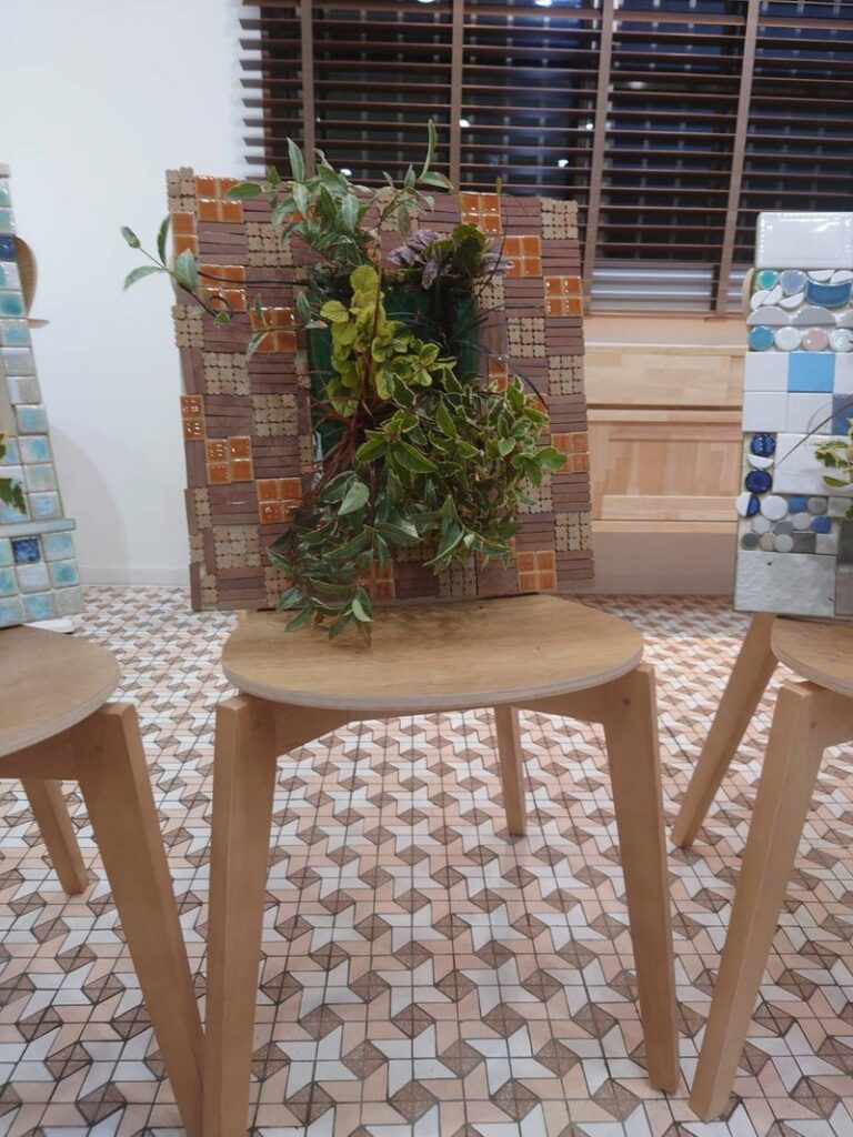 今回作成したのは、中央に穴の開いた板にタイルを貼り、そこにお花を生ける「壁掛けフラワーアレンジメント」です。