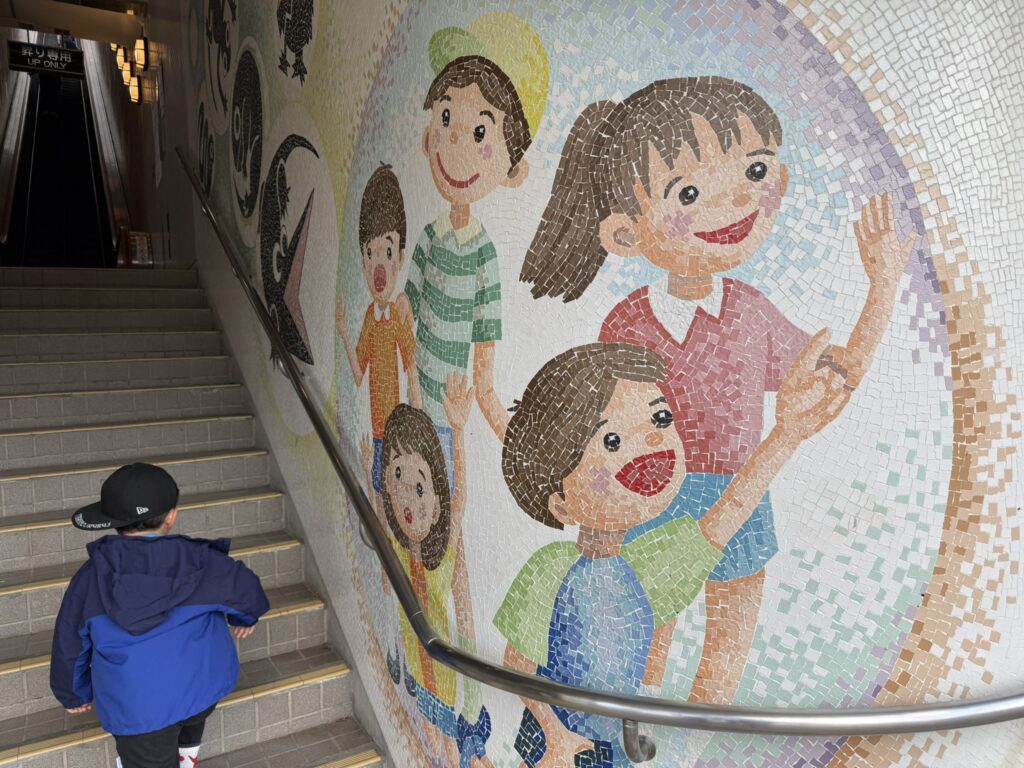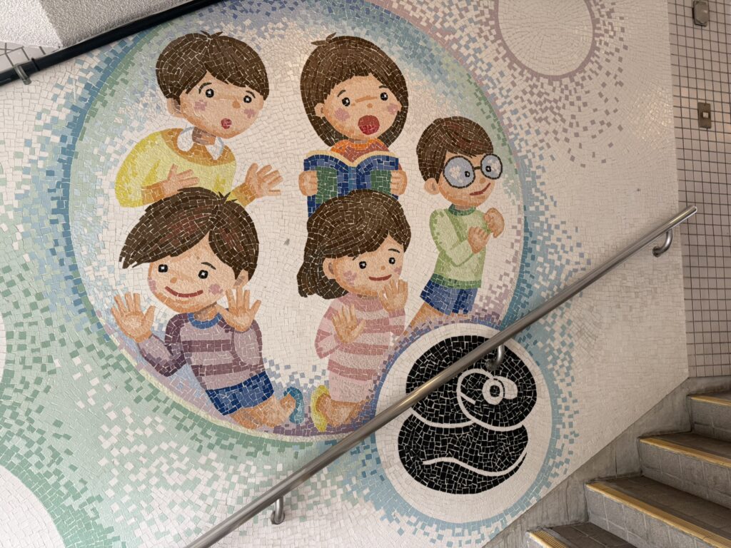 さらに、本園から北園エリアへ抜けるエレベーターの入り口階段にも、心温まるアートがあります。