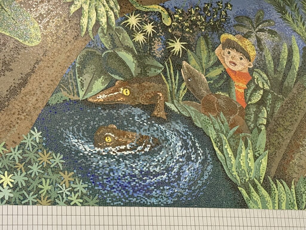 深い緑と水辺、そこに潜むワニやヘビ。 ジャングルを探検する子供たちの姿が、色鮮やかなタイルで見事に表現されています。