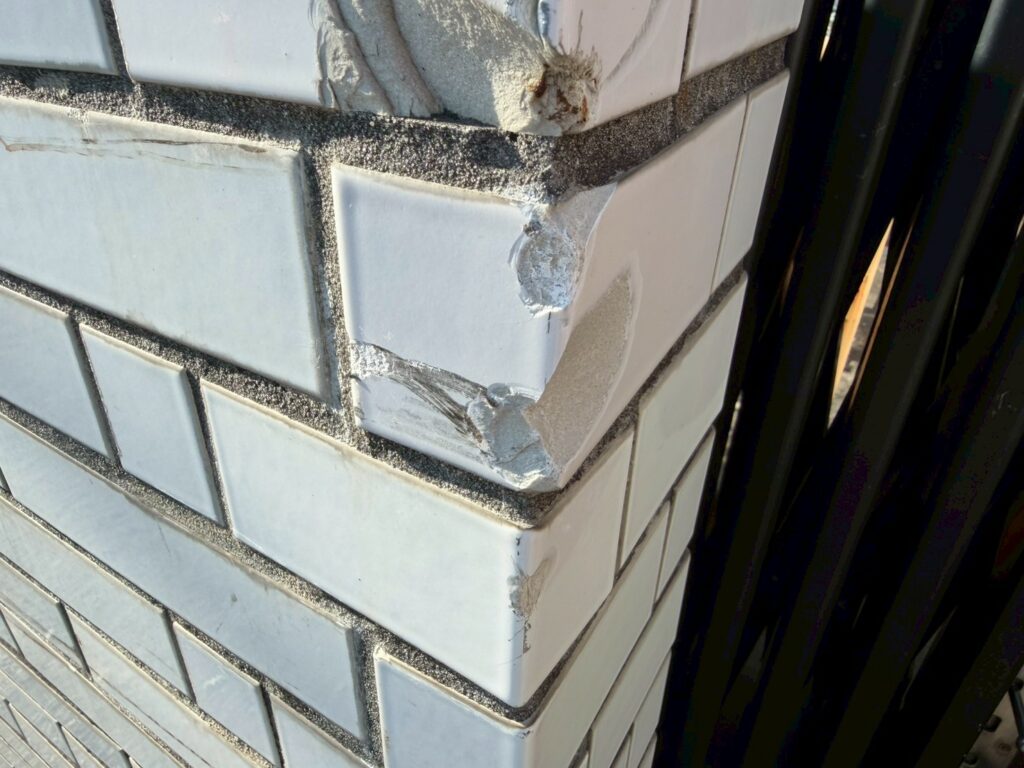 外構の塀に使われている「二丁掛(にちょうがけ)」と呼ばれるサイズ(約227×60mm)のタイルです。 角の部分が欠けてしまっていますね。