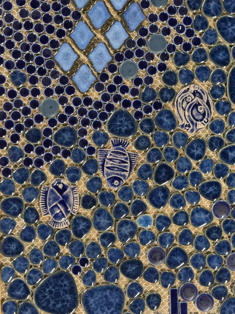 海の中を泳ぐ魚たちも、既製品のタイルと、手作業でカットしたパーツを組み合わせて表現しています。