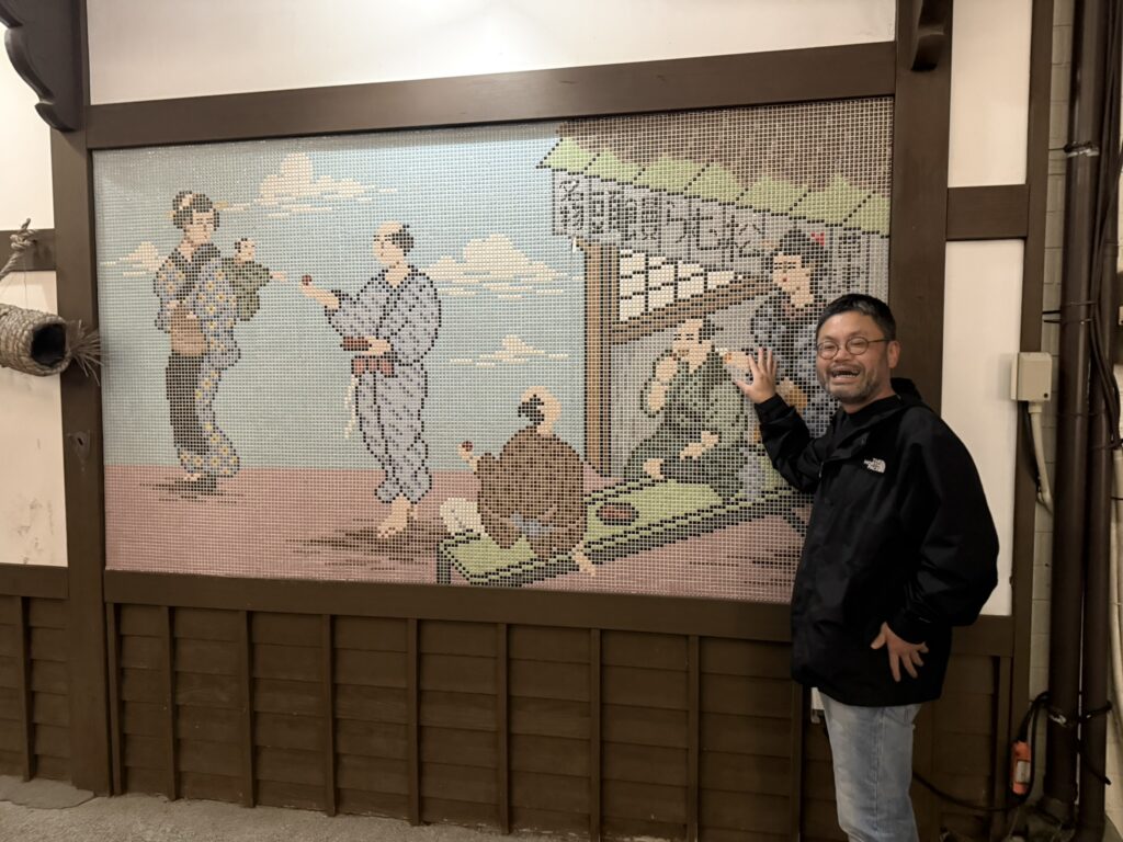老舗のお饅頭屋さんで見つけたのが、この見事なモザイクタイルアート。 10mm角(1センチ角)の小さなタイルを組み合わせて、昔ながらの情景を描いています。
