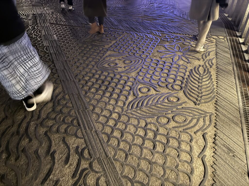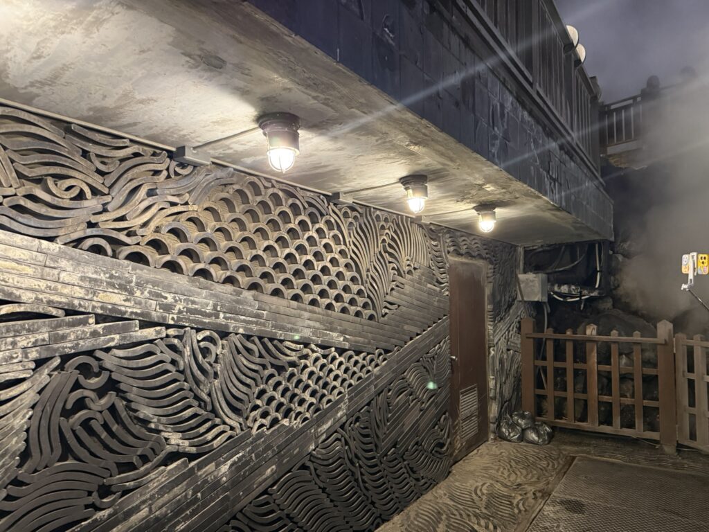 瓦を積み重ねたような、重厚な「瓦壁」です。 いぶし色の濃いグレーが、夜のライティングに照らされて非常に美しい陰影を作っていました。