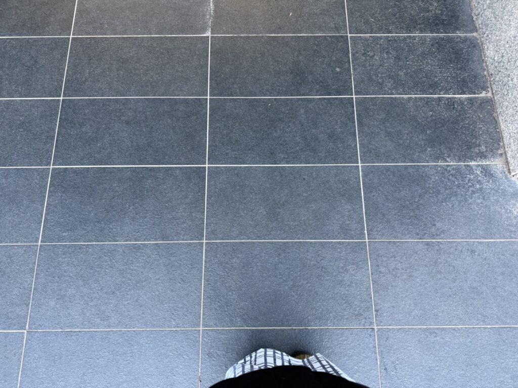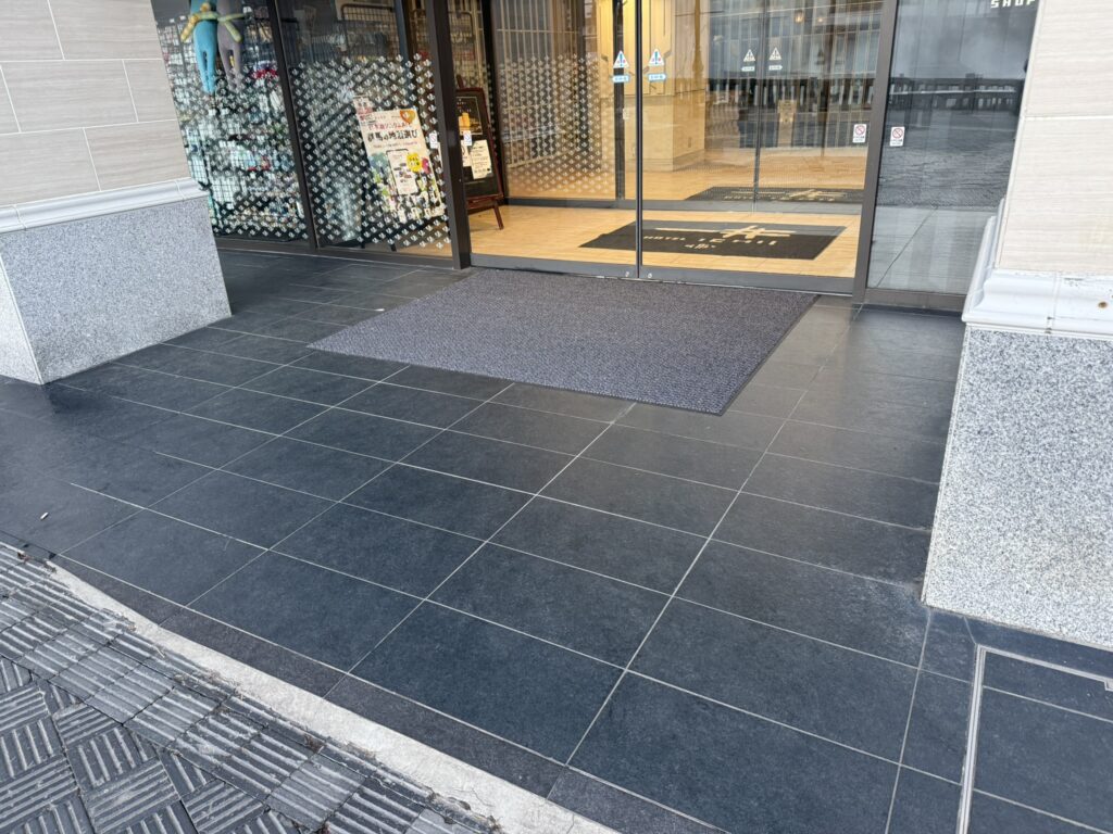 こちらは比較的新しい建物でしょうか。 300×600mmサイズの大判の黒いタイルが使われていました。 最近のホテルやマンションのエントランスでは、このサイズの人気が非常に高いです。空間が広く、高級に見える効果があります。