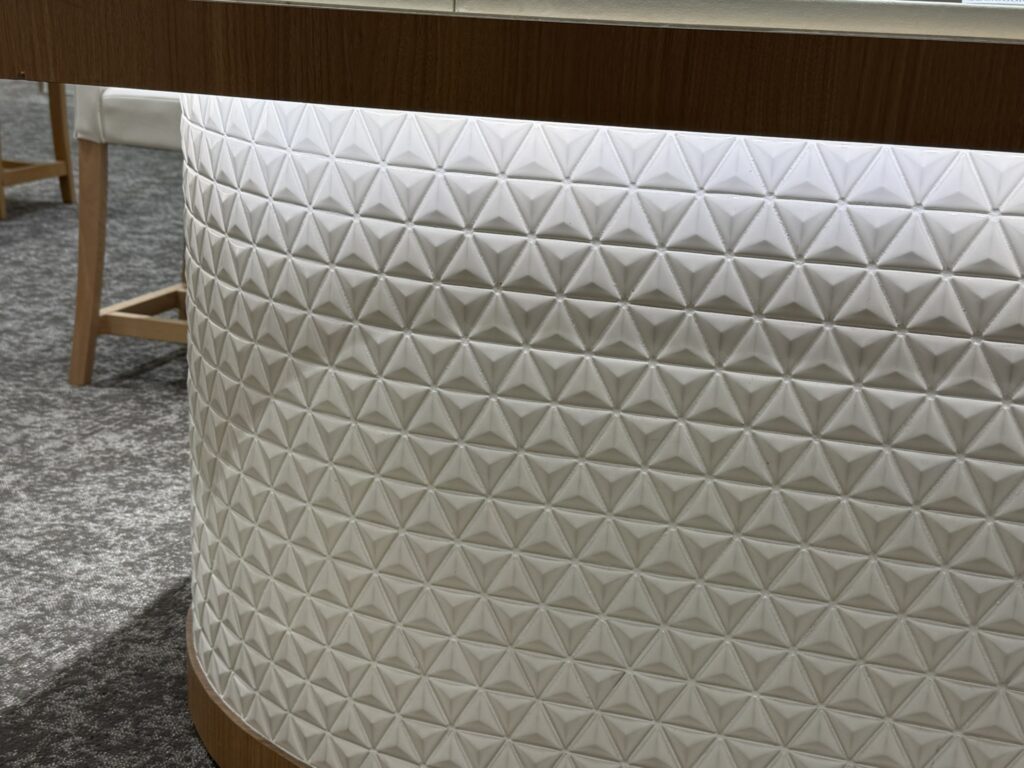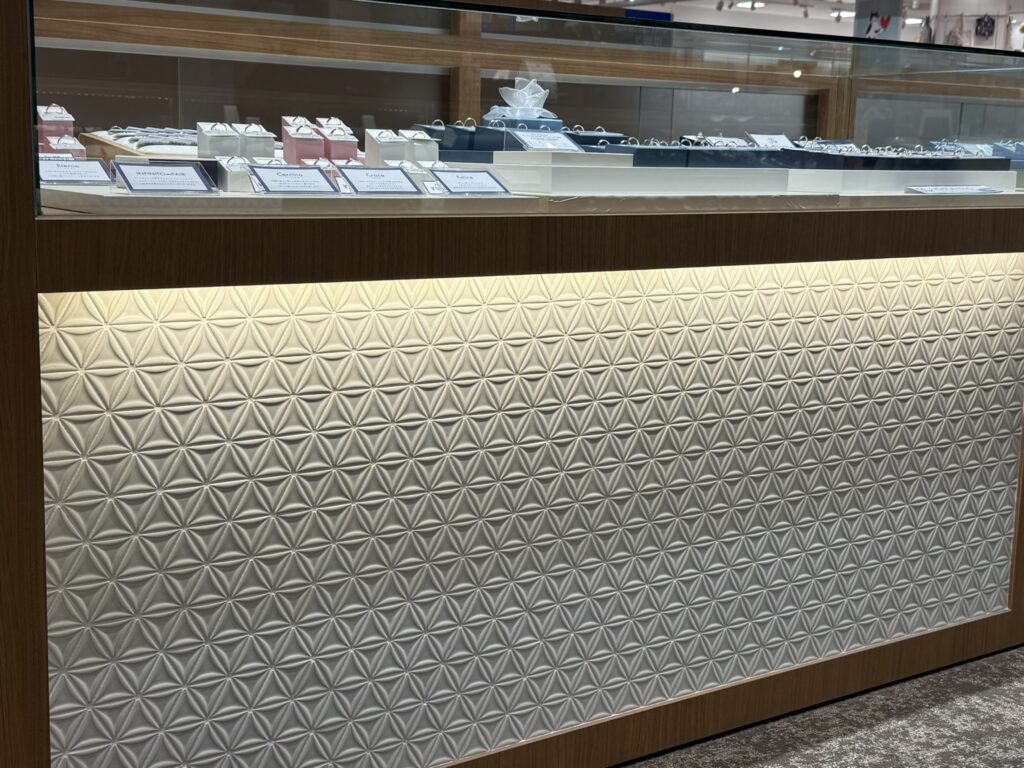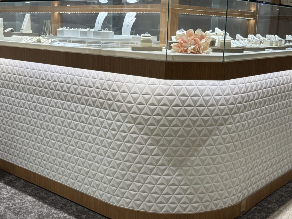 ジュエリーショップという場所柄、あまり派手な色を使ってしまうと、主役である指輪やネックレスが霞んでしまいます。 そのため「白」を選ぶのは定石ですが、単なる白い塗装や平面のタイルでは、少し寂しく、安っぽく見えてしまうこともあります。
