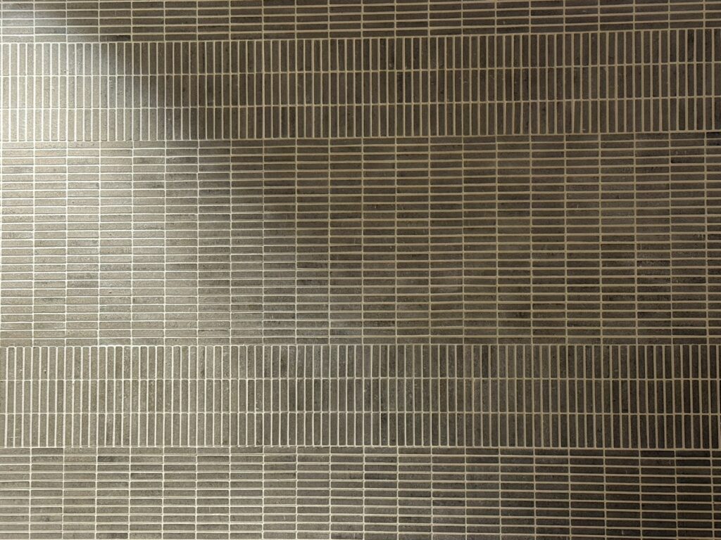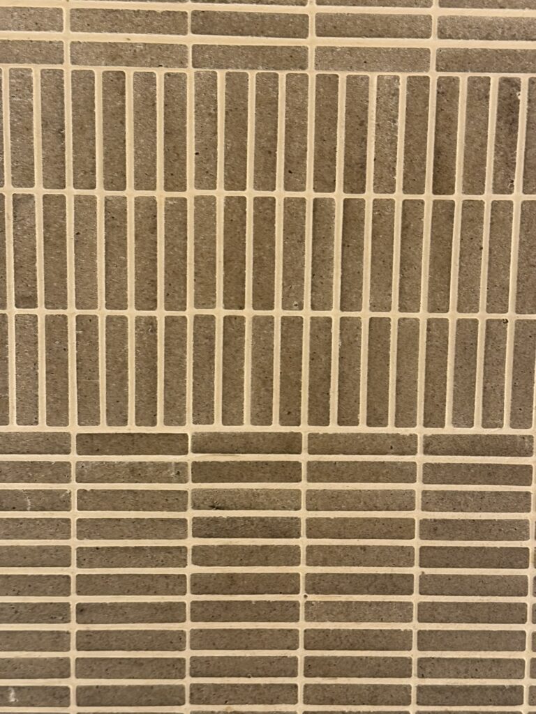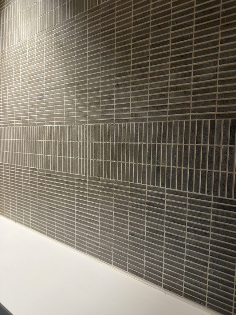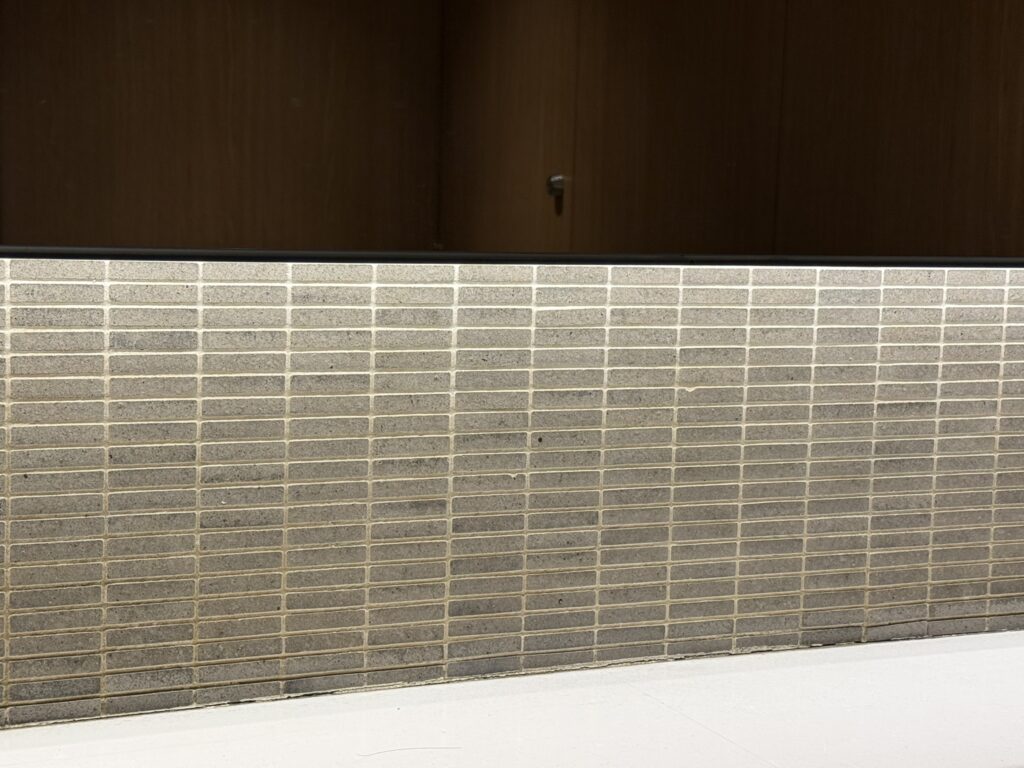 壁一面に貼られていたのは、細長いレンガ風のボーダータイルです。 グレーがかった落ち着いた色味で、表面には土の温かみを感じるテクスチャがあります。