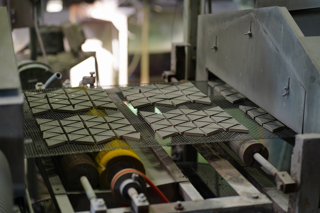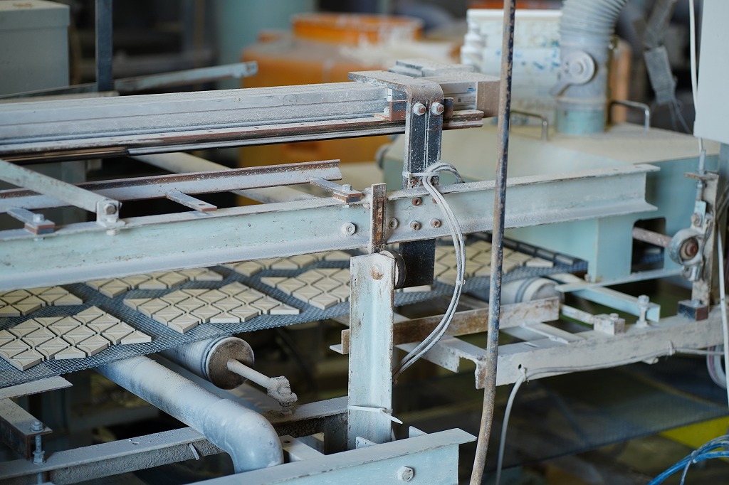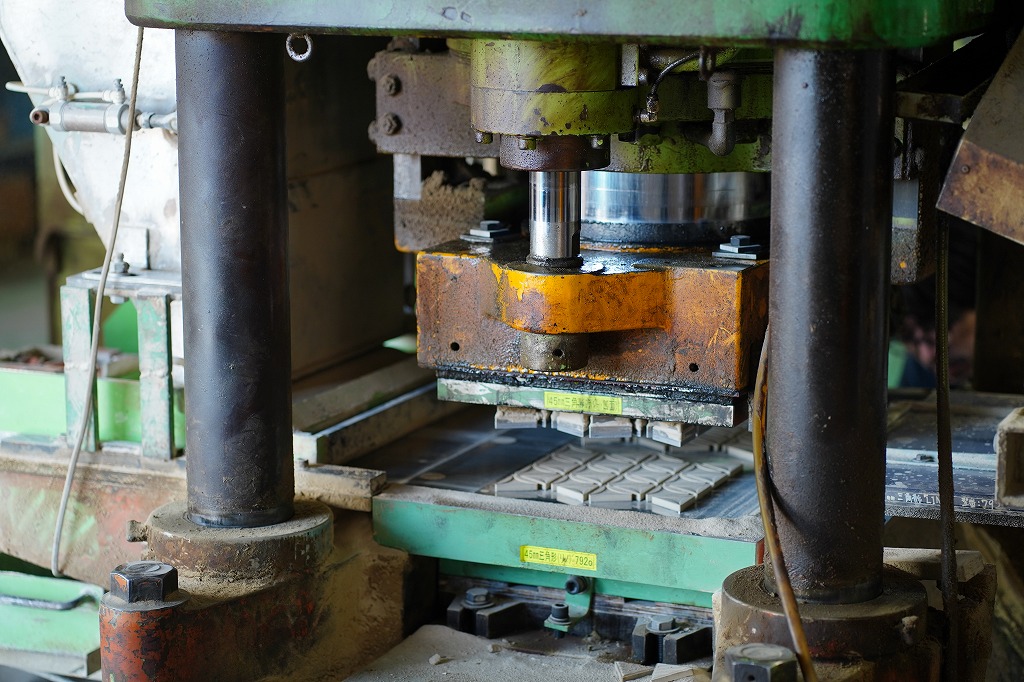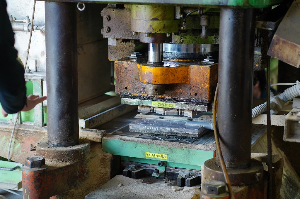 粘土を型に入れ、数百トンの圧力でタイルの形をつくる工程です。