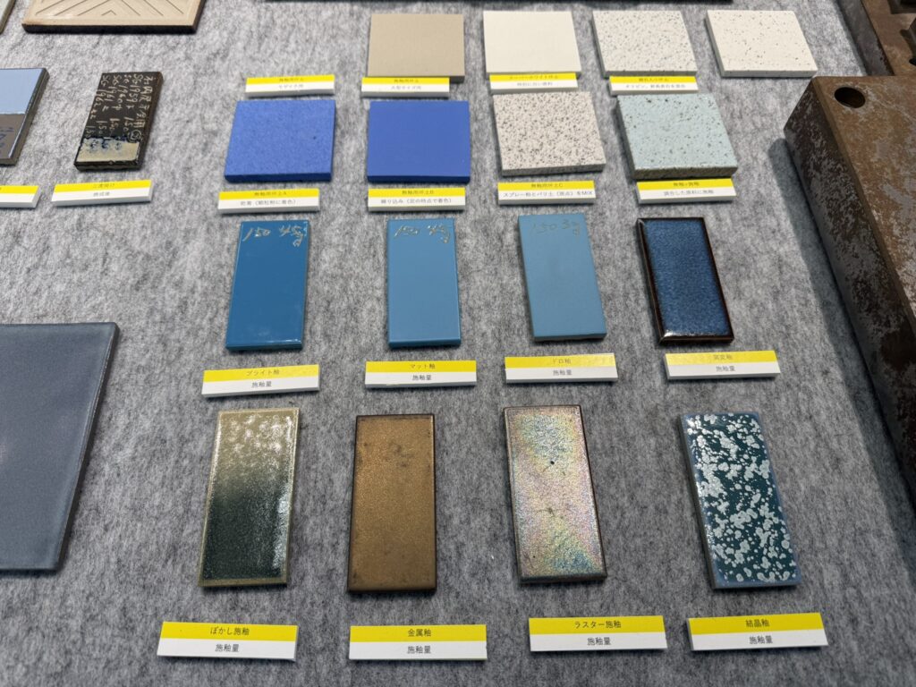 釉薬(うわぐすり)の配合や作り方を変えるだけで、これだけ質感に差が出ます。 お客様が「もっとマットな青がいい」「キラキラした青がいい」とおっしゃるご要望に応えるため、メーカーさんは日々研究を重ねているのです。