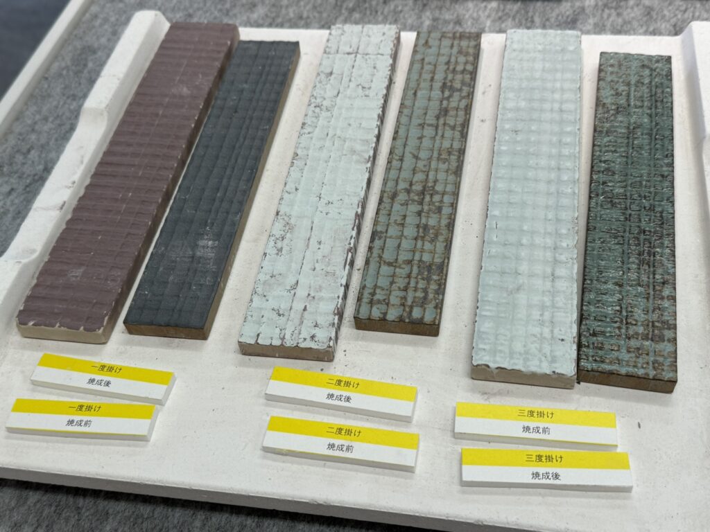 また、釉薬を重ねる回数でも表情は変わります。 左から「一度掛け」「二度掛け」「三度掛け」の比較です。 回数を重ねるごとに、表面の凹凸感が増し、色が深くなっているのが分かります。 手間をかけることで、重厚感のあるタイルが生まれるのですね。