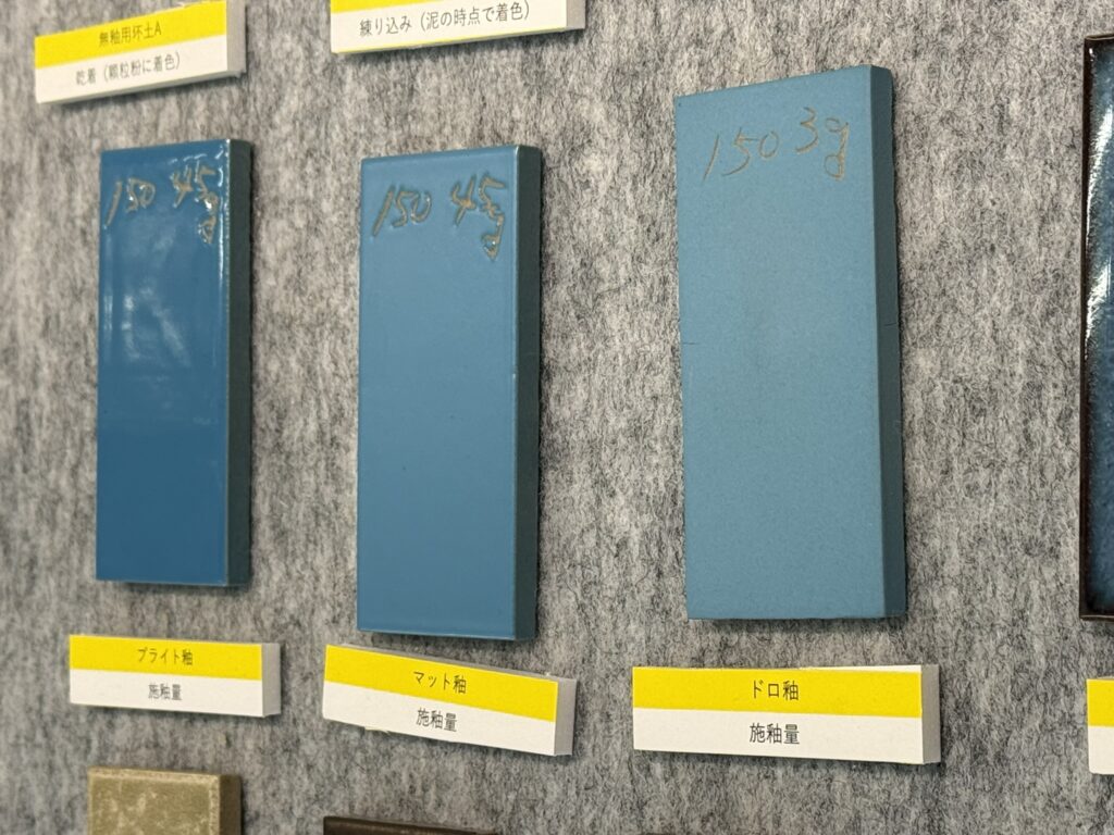 実はこれ、3つとも「同じ青色顔料」を「同じ量」使っているそうです。 それなのに、左はツヤのあるブライト釉、真ん中はマット釉、右はドロ釉(土の質感を残したもの)と、全く違う表情をしています。