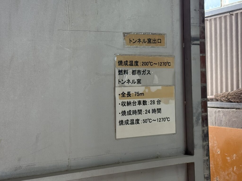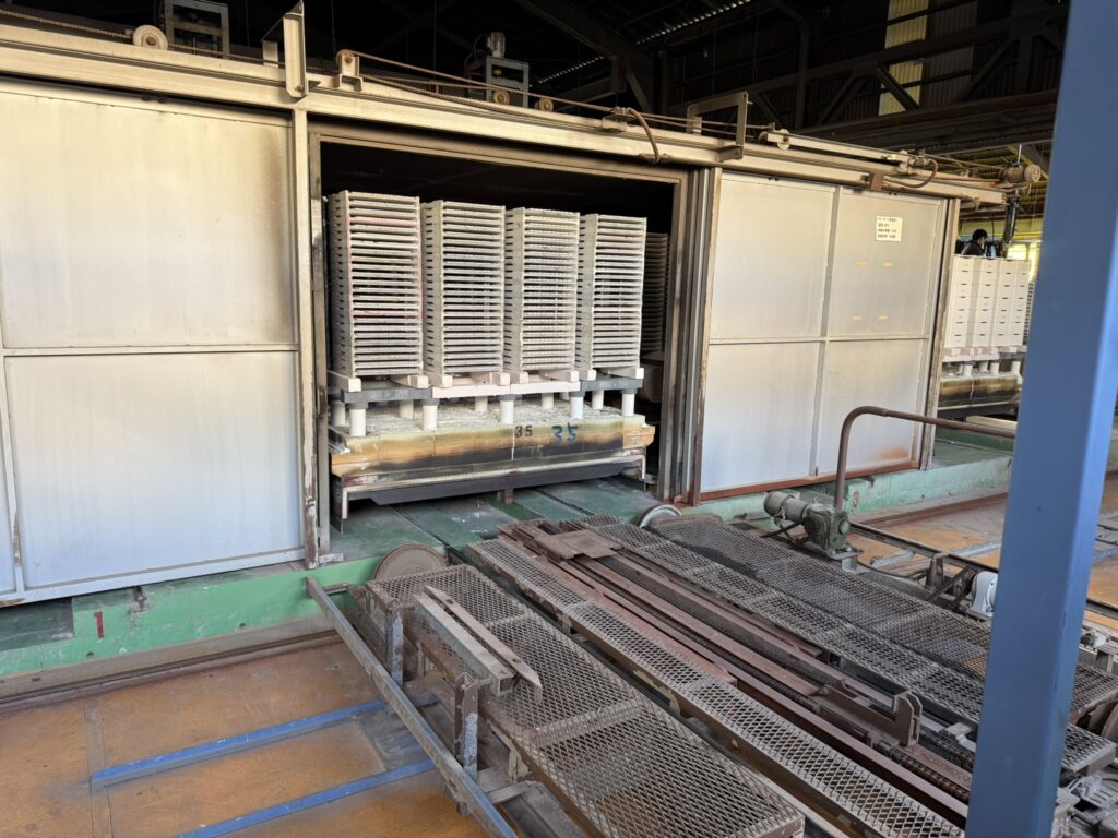 最高温度は1270度。 入り口から徐々に温度を上げ、最高温度で焼き締め、そしてゆっくり冷ます。 この長い旅を経て、ようやく一枚のタイルが完成します。