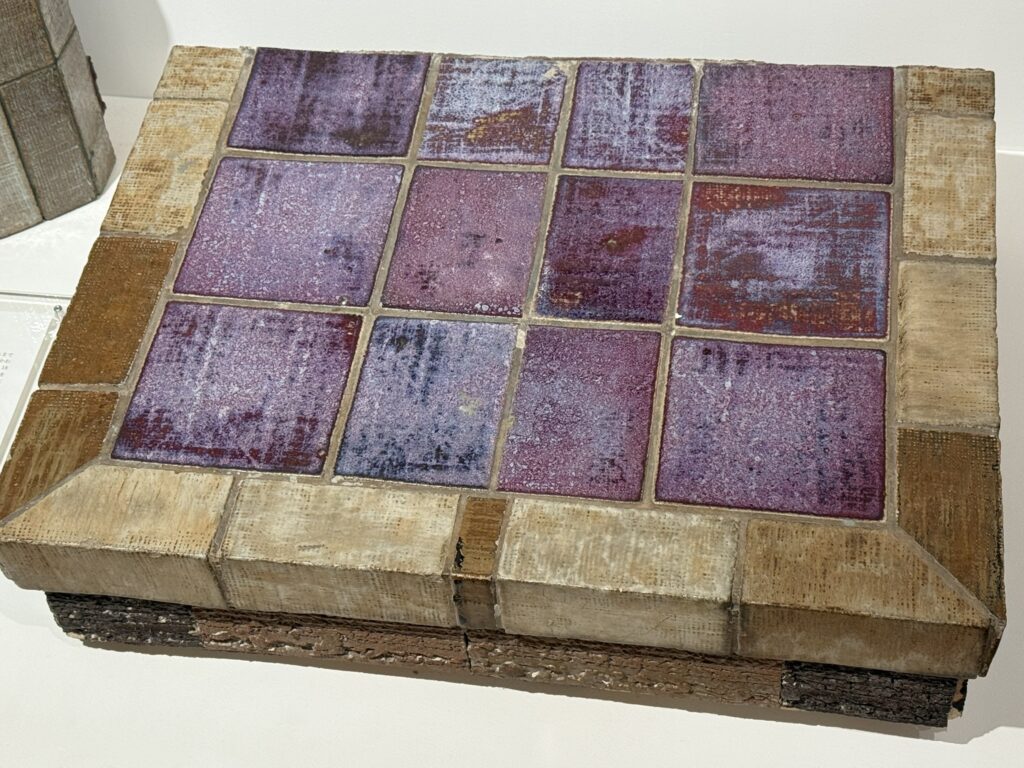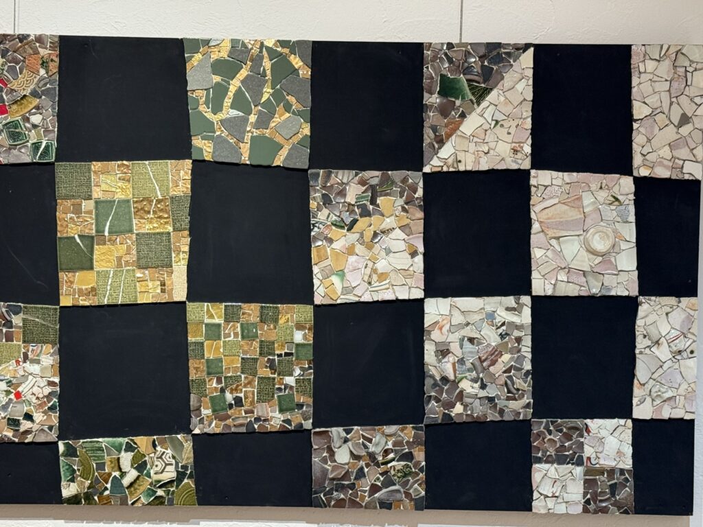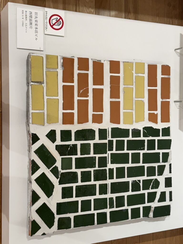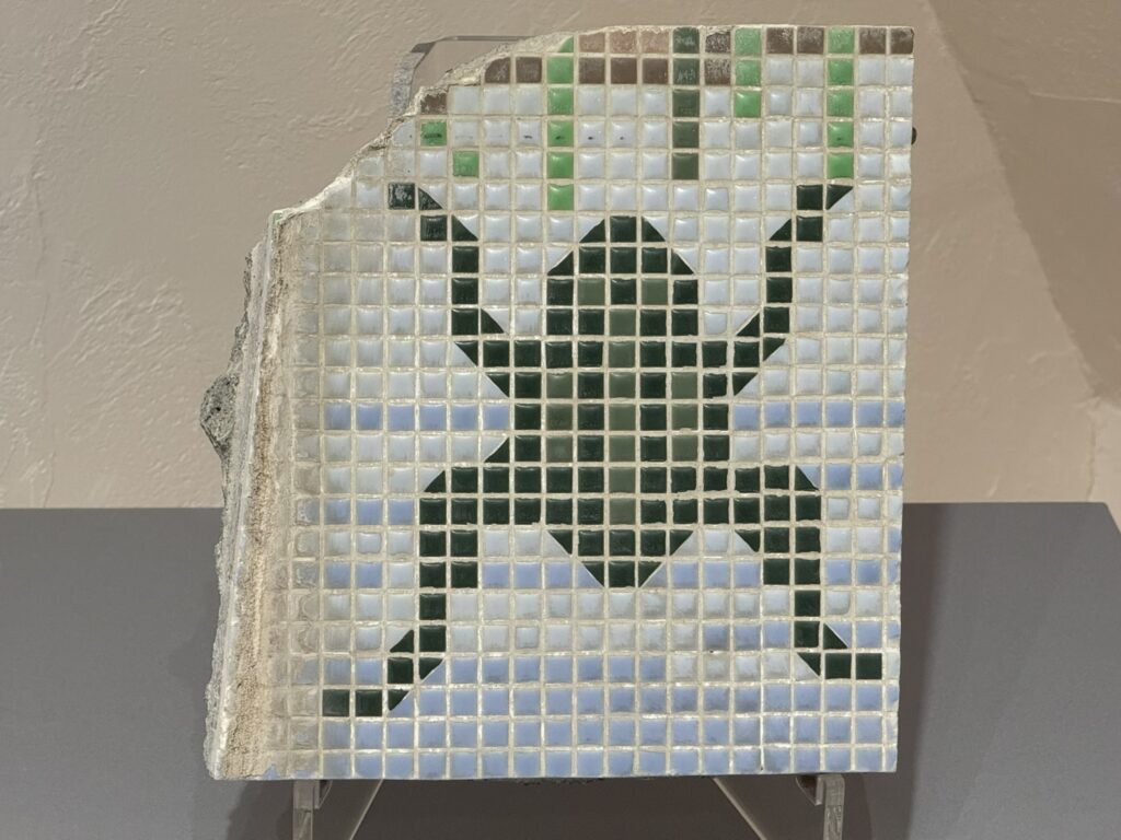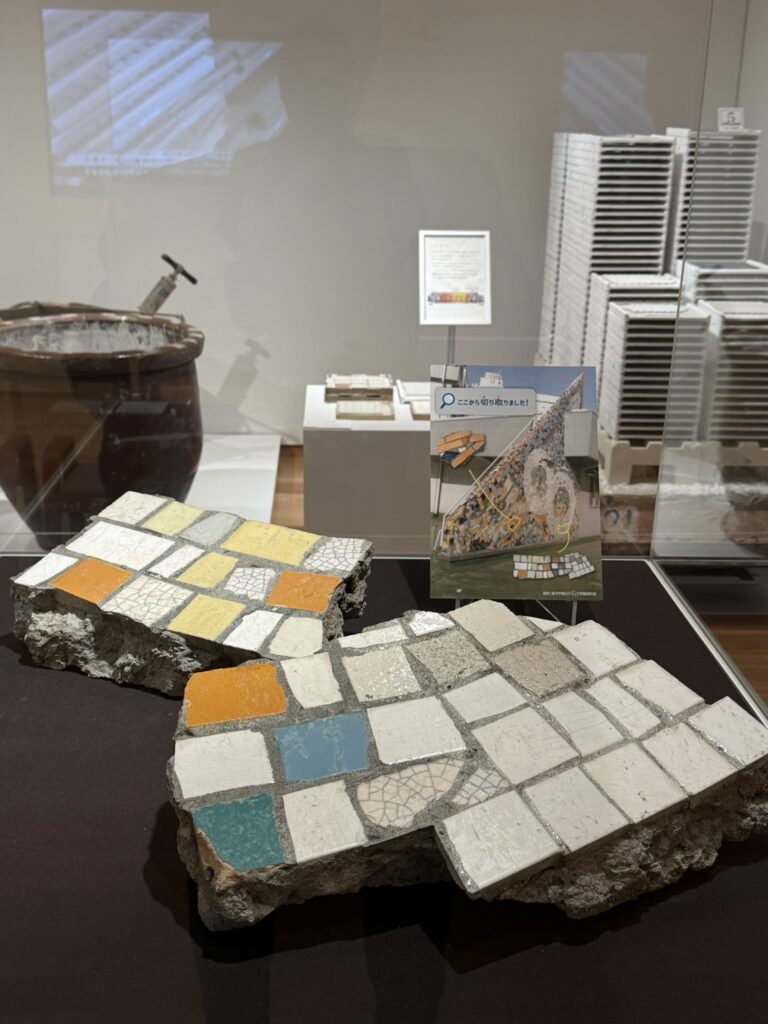 この展示では、新収蔵品に加えて、普段目にすることの少ない「レスキュータイル」や、かつての建築を彩ったタイル壁画の断片、モザイク作品が紹介されています。解体現場から救い出されたタイルの断片たちは、かつての建物で人々の暮らしを彩っていた記憶を静かに語りかけてきます。
