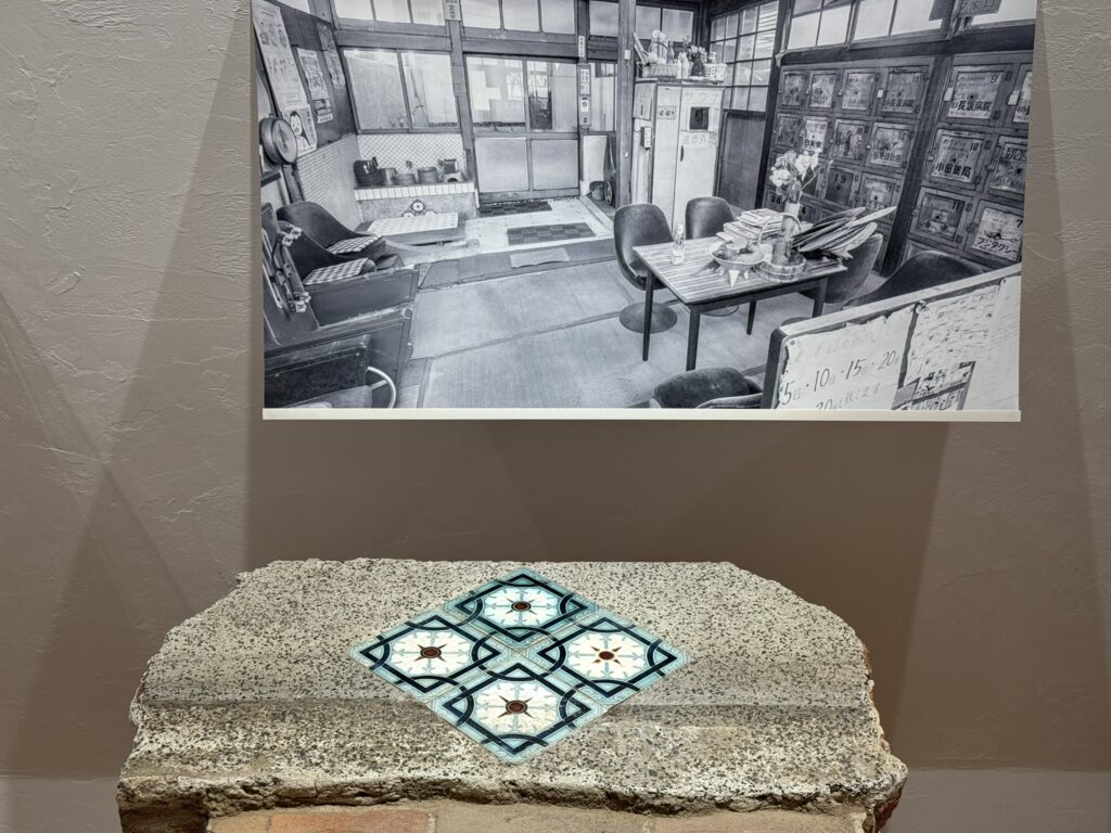 モザイクタイルミュージアムのルーツは、1990年代初頭に町内の有志によって始まった「モザイク浪漫館」の膨大な資料収集活動にあります。タイルのピース、見本台帳、さらにはタイルでできた浴槽や流し台、建物の壁や床の一部に至るまで、その収集品は多岐にわたります。本展では、特に解体現場から救出された部材に焦点を当て、当時の写真資料とともに、タイルが人々の暮らしの中でどのように息づいていたのかを追体験することができます。